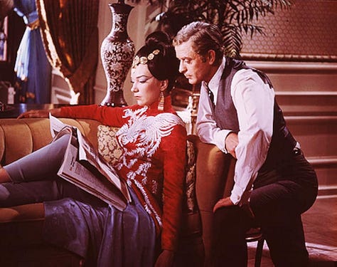 Gambit is a heist caper starring Michael Caine as the mastermind Harry Dean, Shirley MacLaine as the bait Nicole Chang, and Herbert Lom as Ahmad Shahbandar, the millionaire mark. Shahbandar has a priceless antique bust, Dean wants it, and Nicole is brought in to distract the millionaire. The trick is that the bust, a portrait of the ancient Chinese empress Li Su resembles Shahbandar’s beloved dead wife as well as a certain Eurasian woman—Shirley MacLaine—that Harry has discovered dancing in a shabby Hong Kong club. Harry plans to ingratiate himself with Shahbandar and use Nicole to dazzle the old man while the thief executes his plan without a hitch.