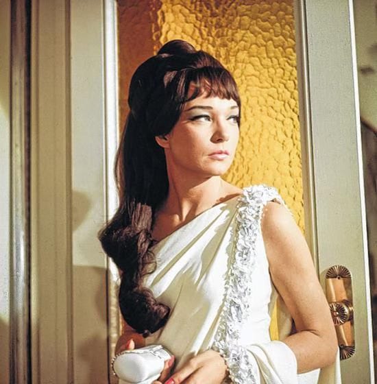 This is a good moment to talk about Gambit’s costumes. For the film, Jean Louis’s remit was narrow. MacLaine’s character has to look beautiful and glamorous but reflect the story’s exotic settings. Louis’s work in Hollywood was known for its femininity and elegance so he was a perfect fit for Gambit. His reliance on the cheongsam reflects the Chinese diaspora to the West and fits MacLaine’s character as an Eurasian woman. The cheongsam or qipao is Chinese in origin but became popular in the West especially in the 1950s and 1960s when Hong Kong became a fashion center. The dress is form-fitting and usually made of silk or satin, often brocade, with or without embroidery, and an asymmetrical closure with fasteners known as frogs (pankous). The dress is completed by a stand-up Mandarin collar and cap sleeves. Louis chooses fabrics in jewel tones in keeping with the bright color palette of 1960s films. The standout costume of the film, however, is not Eastern but a white crepe, one-shoulder toga gown which MacLaine wears with her hair down. The fact that this costume is clearly Western-influenced indicates that Nicole’s character has fully departed from Harry’s guiding plan and is striking out on her own. Her loose hair and natural makeup further emphasize that she is liberated from her would-be tutor and his supposedly perfect heist scheme.